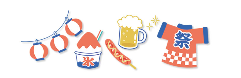 ビール、ジュース、かき氷、焼き鳥、フランク、ベビーカステラ、ポップコーン、フライドポテトなどなど